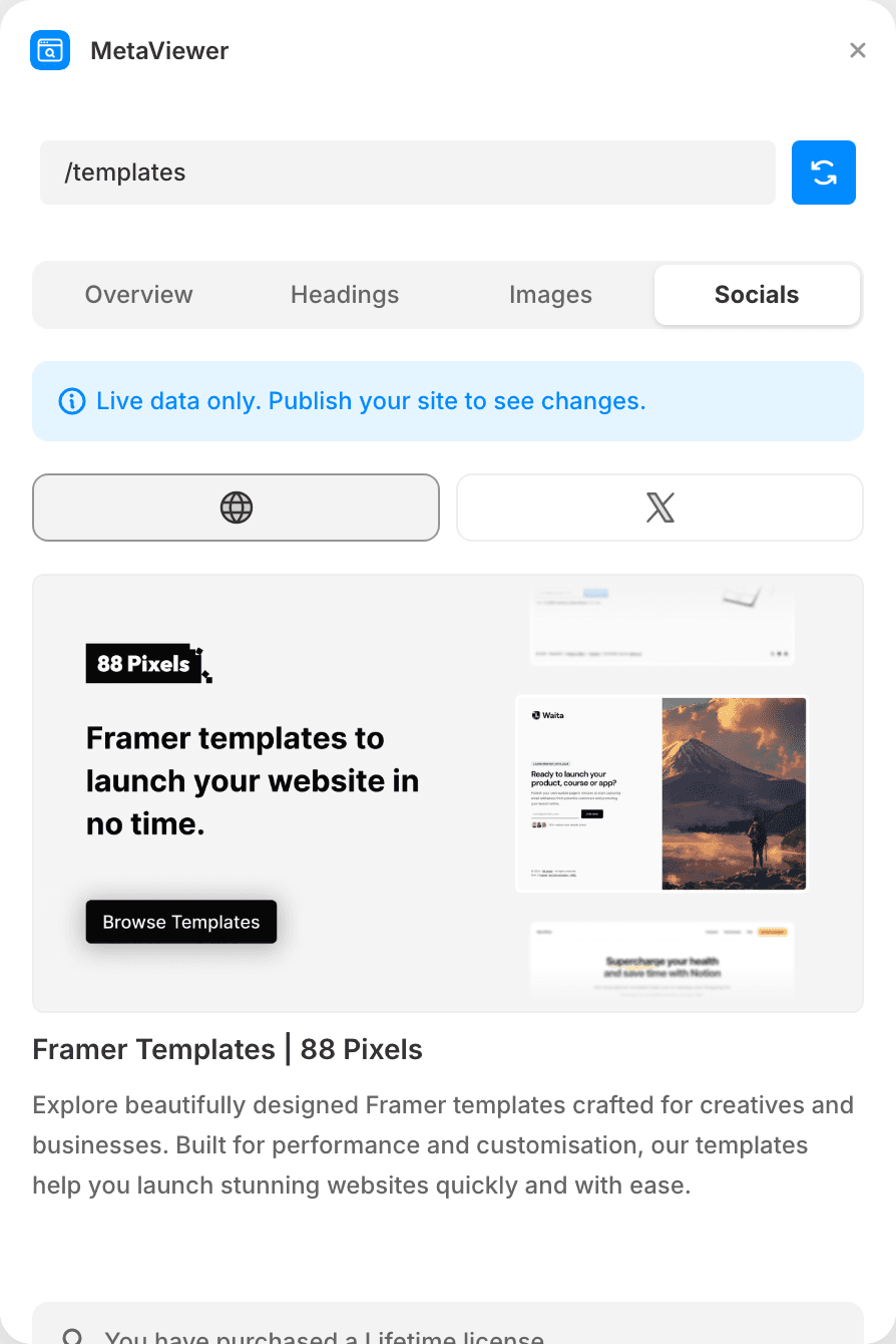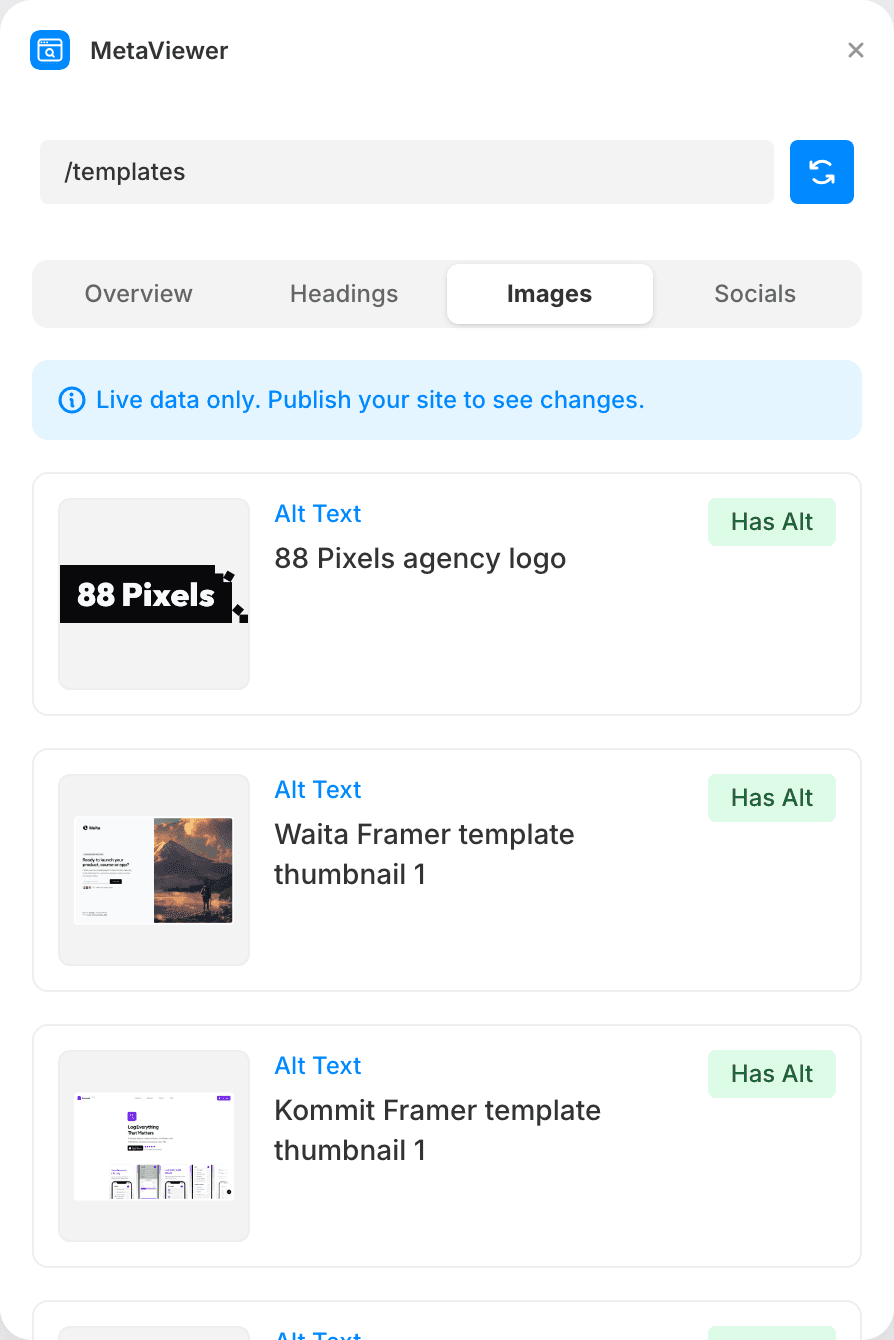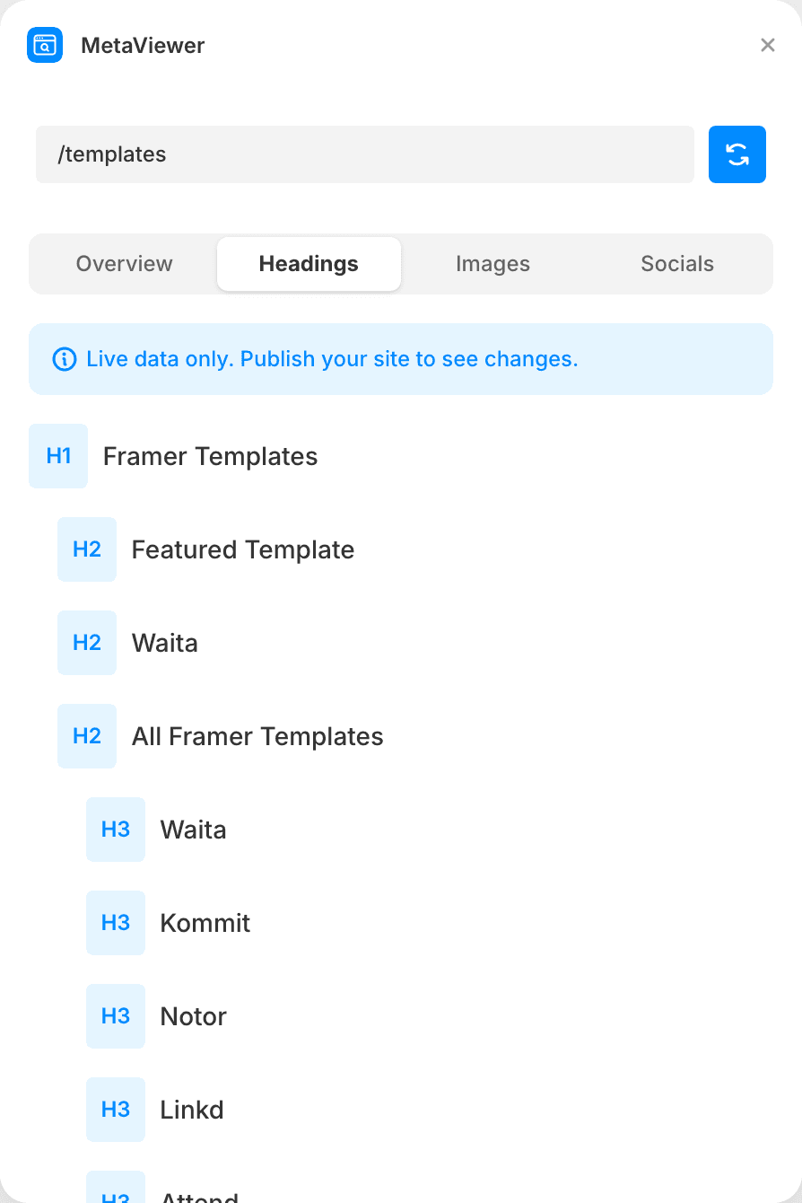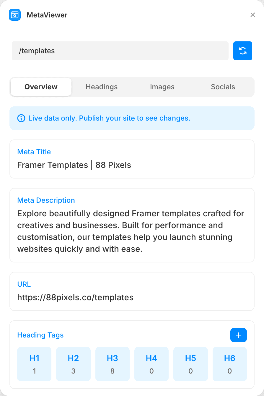 Get real-time insights on meta titles, descriptions, heading structure, image alt text, and social sharing previews without leaving Framer.